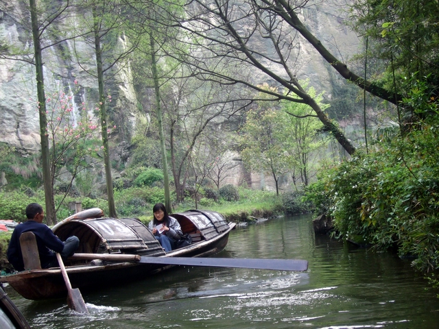 接下來去了與杭州西湖齊名, 有天下第一盆景之稱的東湖, 風景相當宜人, 阿炬自己有一對雙胞胎女兒, 其實我們這個家族的相貌基因非常強, 阿明和我弟弟長得很相像, 而雙胞胎豆豆米米和我妹妹也長得非常神似, 所以他們都特別喜歡這個遠地來的姪兒, 血濃於水的親情是天生的. 兩人一組搭著紹興特有的烏蓬船遊東湖, 倒也其樂融融, 不過兒子也鬧了一個笑話, 當阿炬表嬸用紹興方言講電話時, 他完全聽不懂, 又和他在學校學的英文與普通話完全不同, 於是就很好奇的問: "你說的是哪一國話啊?"
