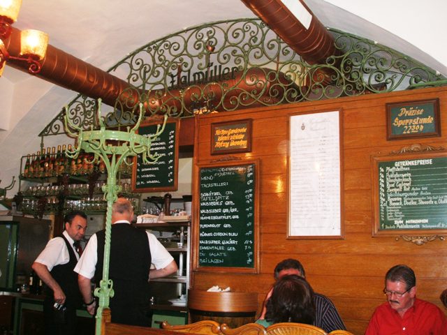 中午我們去的是維也納的知名餐館Figlmuller, 這個餐館以超大號豬排知名,根據接待人員人的建議, 我們只點了一客馬鈴薯沙拉,一份超大號豬排, 和一杯飲料。
