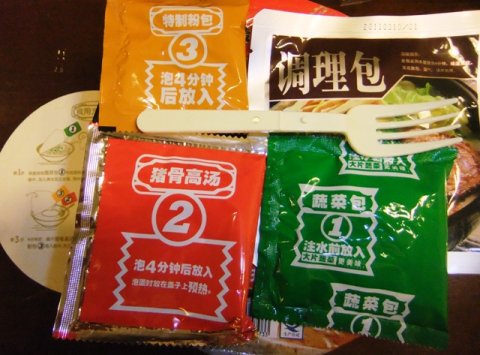 因為是非油炸麵條, 所以為了防止受潮, 面餅也加了一個塑膠袋來包装。而且總共有四包料, 1號是蔬菜包,2號是豬骨高湯,3號是調味粉, 4號是叉燒肉軟罐頭, 因為有點複雜, 所以又加了一張調理說明書。